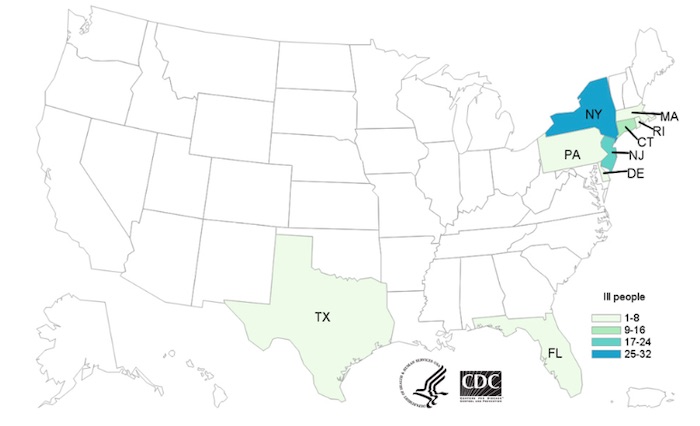 The U.S. Food and Drug Administration (FDA) and the CDC used traceback and epidemiologic evidence to identify the source of the outbreak as Cavi brand whole, fresh papayas imported from Mexico. Seventy-four percent of the people interviewed, 25 of 34, reported eating papayas in the week before they became ill. Two people from Florida and one person from Texas ate papayas while traveling in the Northeast. The cases totals from the nine states are: CT (15), DE (1), FL (2), MA (6), NJ (22), NY (29), PA (4), RI (1), TX (1).