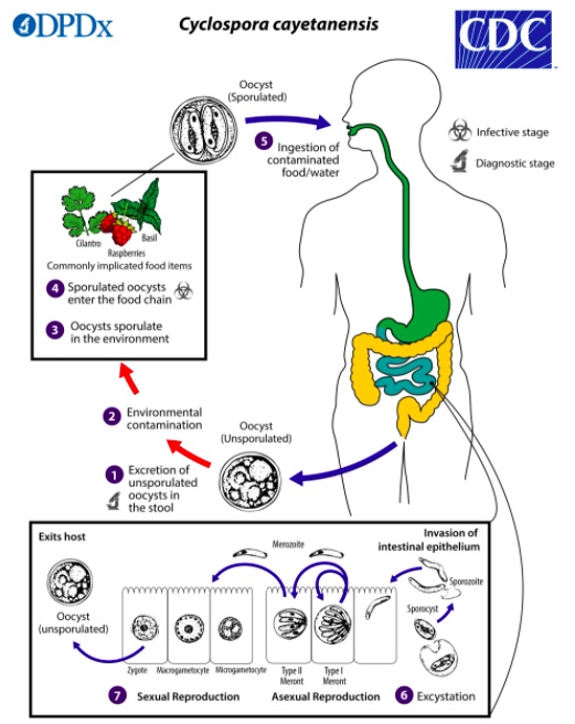 All parasites need hosts. And Cyclospora needs humans to complete their life cycle. People with Cyclospora infections shed oocysts, cysts containing fertilized eggs, in their stool. After one to two weeks in the environment, these cysts sporulate and become infectious. If the sporulated oocysts make direct contact with fruits and vegetables, or the water used to grow or process them, these foods are contaminated and will cause illness when ingested. When the oocysts reach the gastrointestinal tract, the sporozoites, (motile spores) break free from the cysts and make their way to the small intestine where they asexually multiply producing what will eventually become an oocyst.