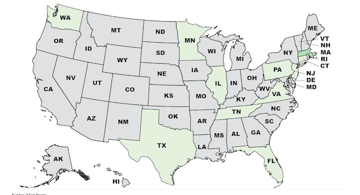 This outbreak includes residents from 11 states: CT, FL, IL, MA, MN, NJ, PA, TN, TX, VA, and WA. They range in age from less than 1 to 82.